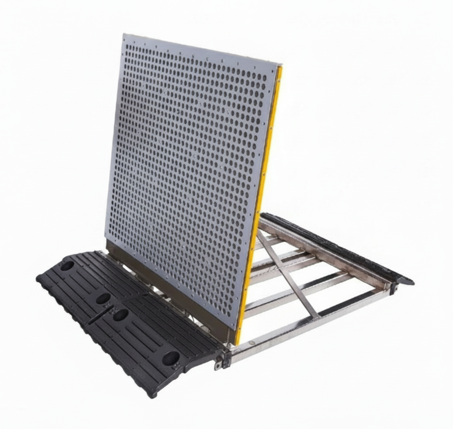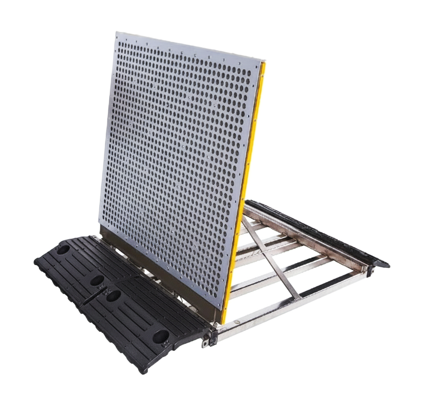 • Panel thickness in the closed position is typically about 2.0” (50 mm) for the 23.6 in (600 mm) height and about 3.9” (100 mm) for the 35.4” and 47.2” (900 and 1200 mm) heights. The top surface is finished as an anti-skid tread, and ramped transitions are designed so that there is no tripping hazard and so vehicles can cross smoothly.