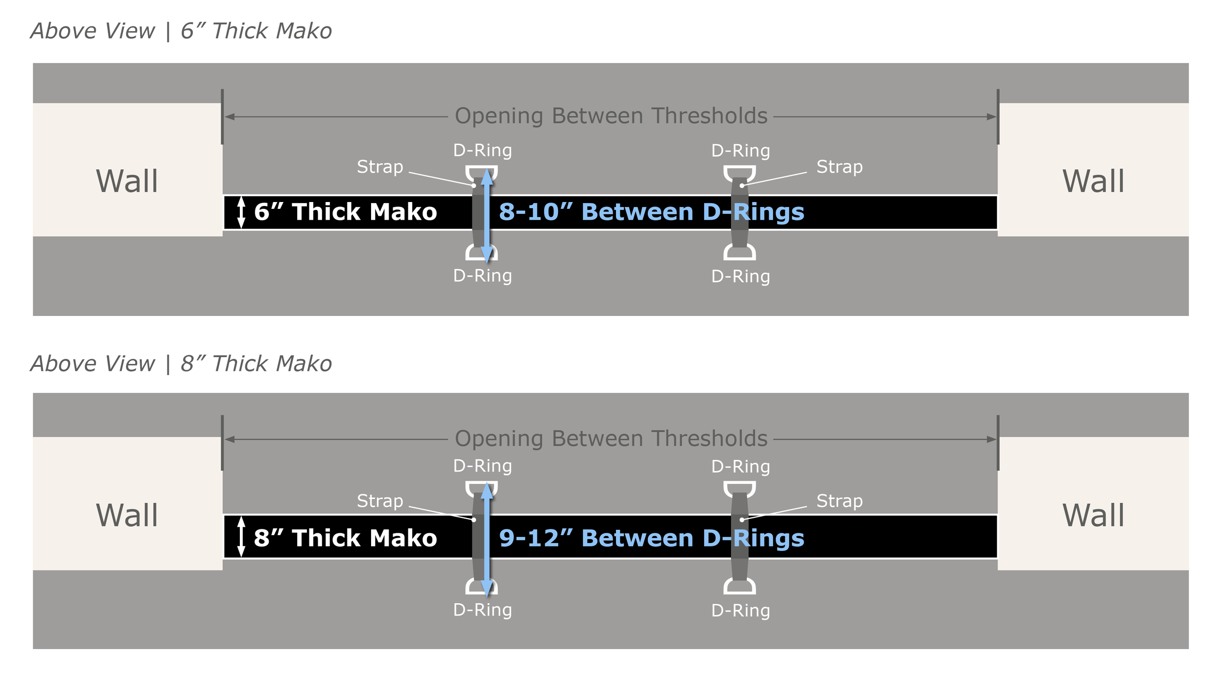 Panels 72” and higher come with included tensioning straps and D-ring connectors to place into the sill or threshold below. Straps are run over the flood panels and are attached to the D-rings on either side of the panel. This secures the panels into place and provides additional downforce for better sealing.