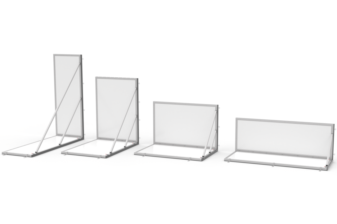 Flood panel sections connect to form an L-shaped flood barrier, which is ballasted downward as floodwater rises against the panels. Diagonal support braces are designed to resist lateral (horizontal) forces - such as wind, seismic activity, or racking forces — by transferring the compression loads down to the ballasted base.
