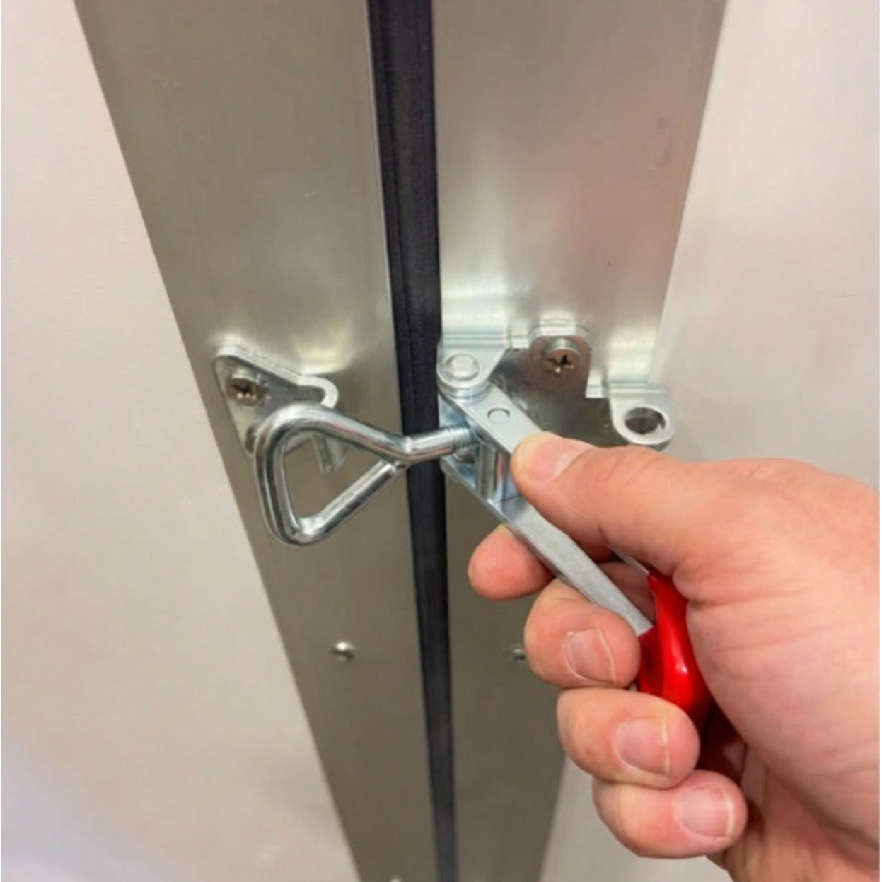 Pull out the latch lever and extend the latch loop across and between panels, and over the receiver hook on the adjacent panel.