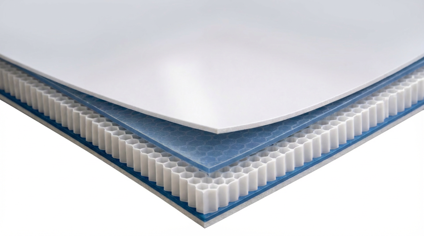 Composite Panel Material: Durable fiberglass exterior shell adhered to a structural honeycomb core with 8mm polypropylene woven mesh cells.