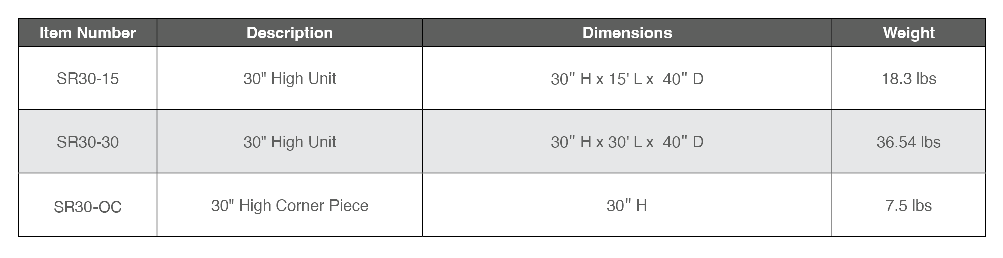 Each unit is available in 15ft and 30ft for ease of mobility and sections can be connected to each other, as needed, to achieve your desired length.